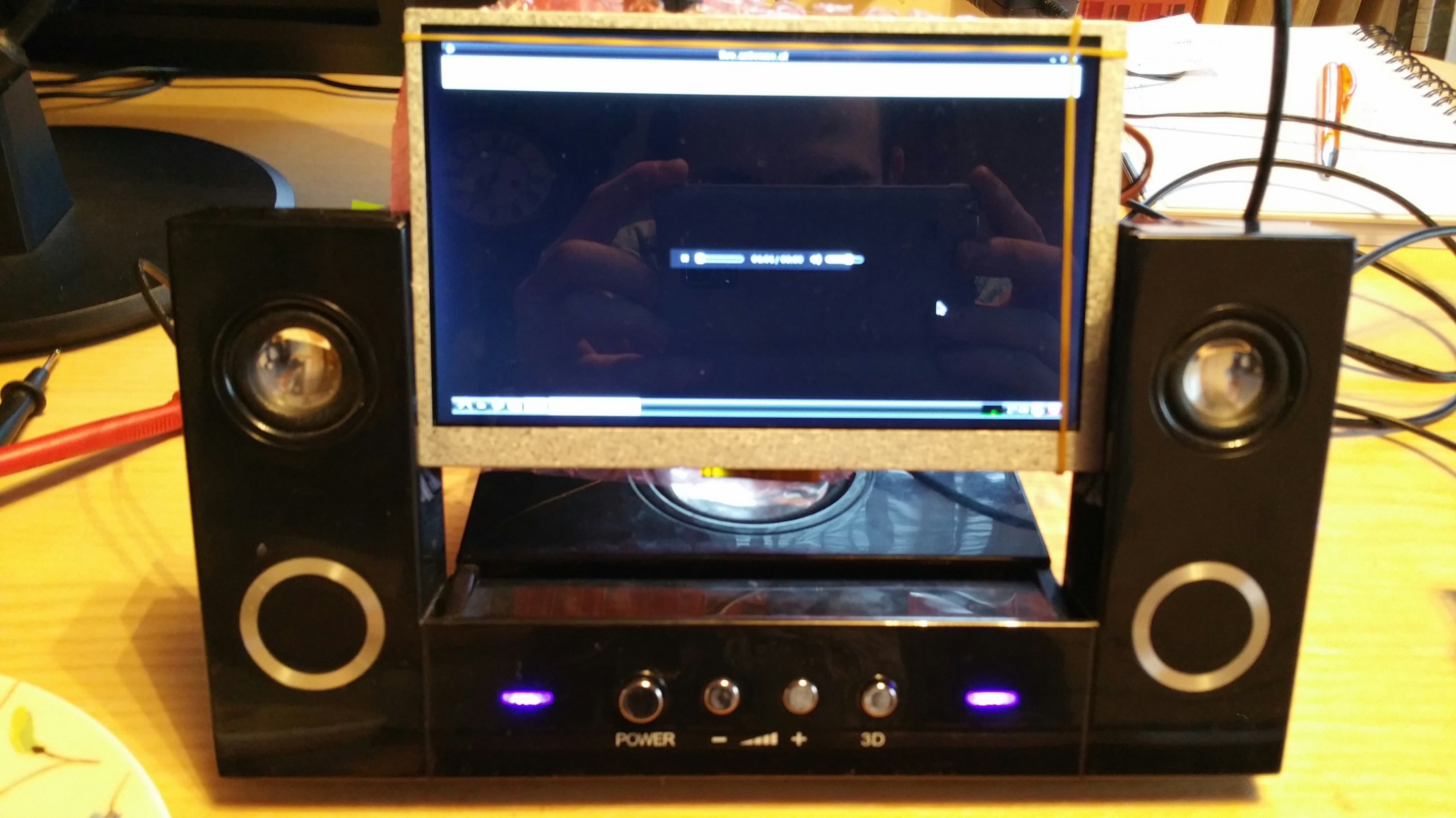 Ich muss nur noch zwei kleine Schlitze hineinschreiben dann passt der Bildschirm dort perfekt hinein. Es lässt sich auch Neigen und hat einen integrierten Verstärker, außerdem funktioniert es mit 5V 1A. Sprich ich kann es über das RPi netzeil betreiben. Die bildschirm Elektronik und der RPi werden mit etwas epoxydkleber, spacer und schrauben an der Rückseite des Displays befestigt. Meine einzige proplematik liegt derzeit noch an den zwei Netzteilen (LCD Screen und RPi /soundsystem) und an der Kabelführung für den Audi Jack und dem hdmi Kabel. Dies soll möglichst esthetisch und formschön verlegt und versteckt werden.